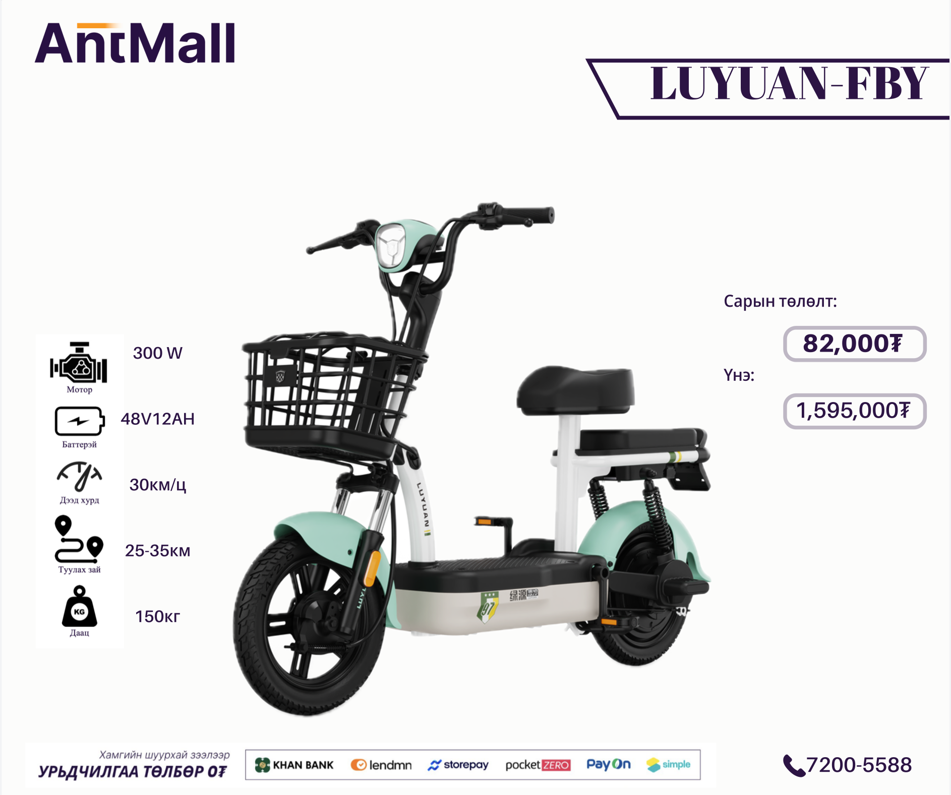 Загвар: LUYUAN-FBYМотор: 300 WБаттерэй: 48V12AHДээд хурд: 25 км/цТуулах зай: 25-35кмДаац: 150кг