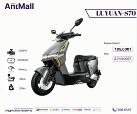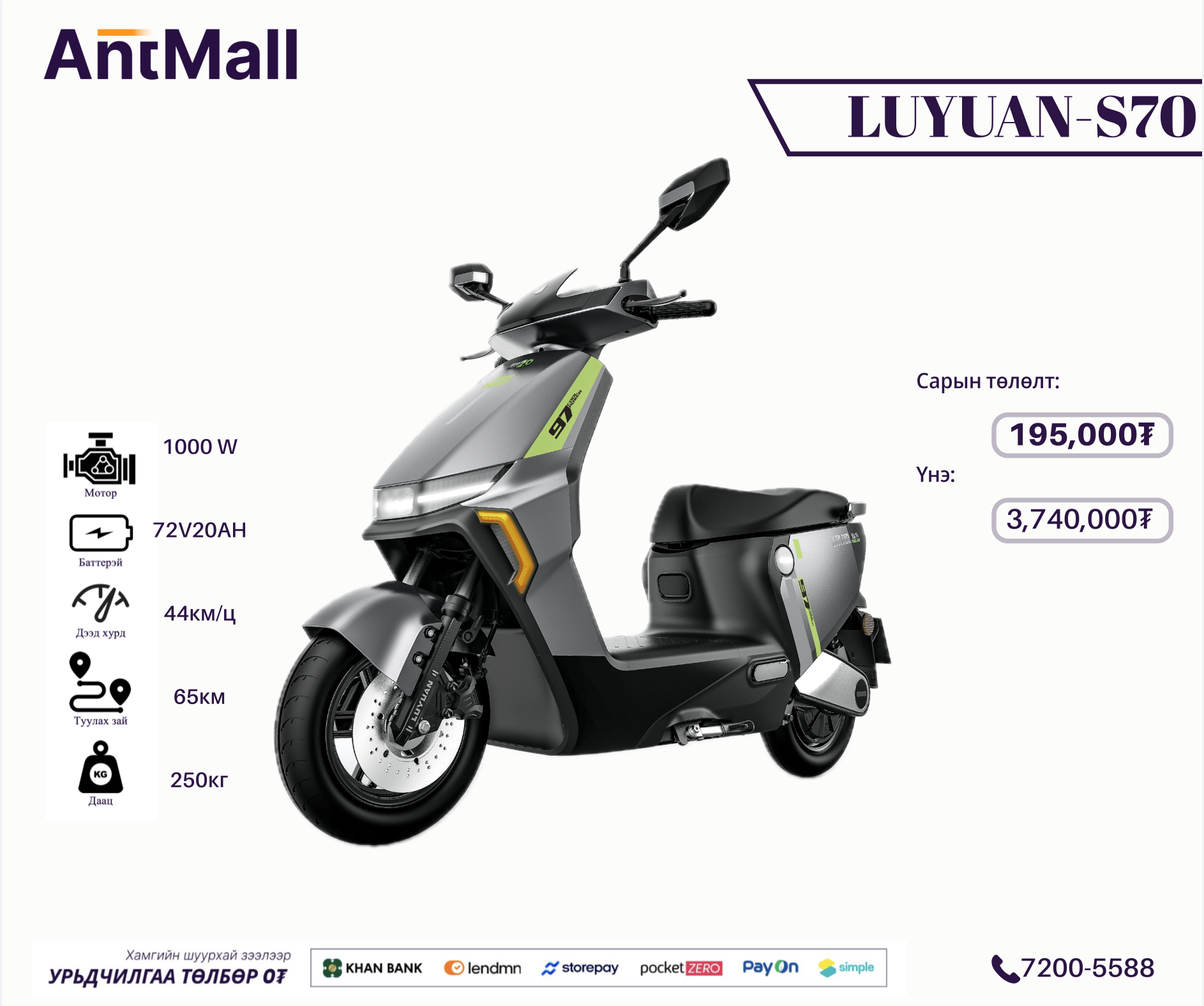 Загвар: LUYUAN-S70Мотор: 1000 WБаттерэй: 72V20AHДээд хурд: 44 км/цТуулах зай: 65кмДаац: 250кг
